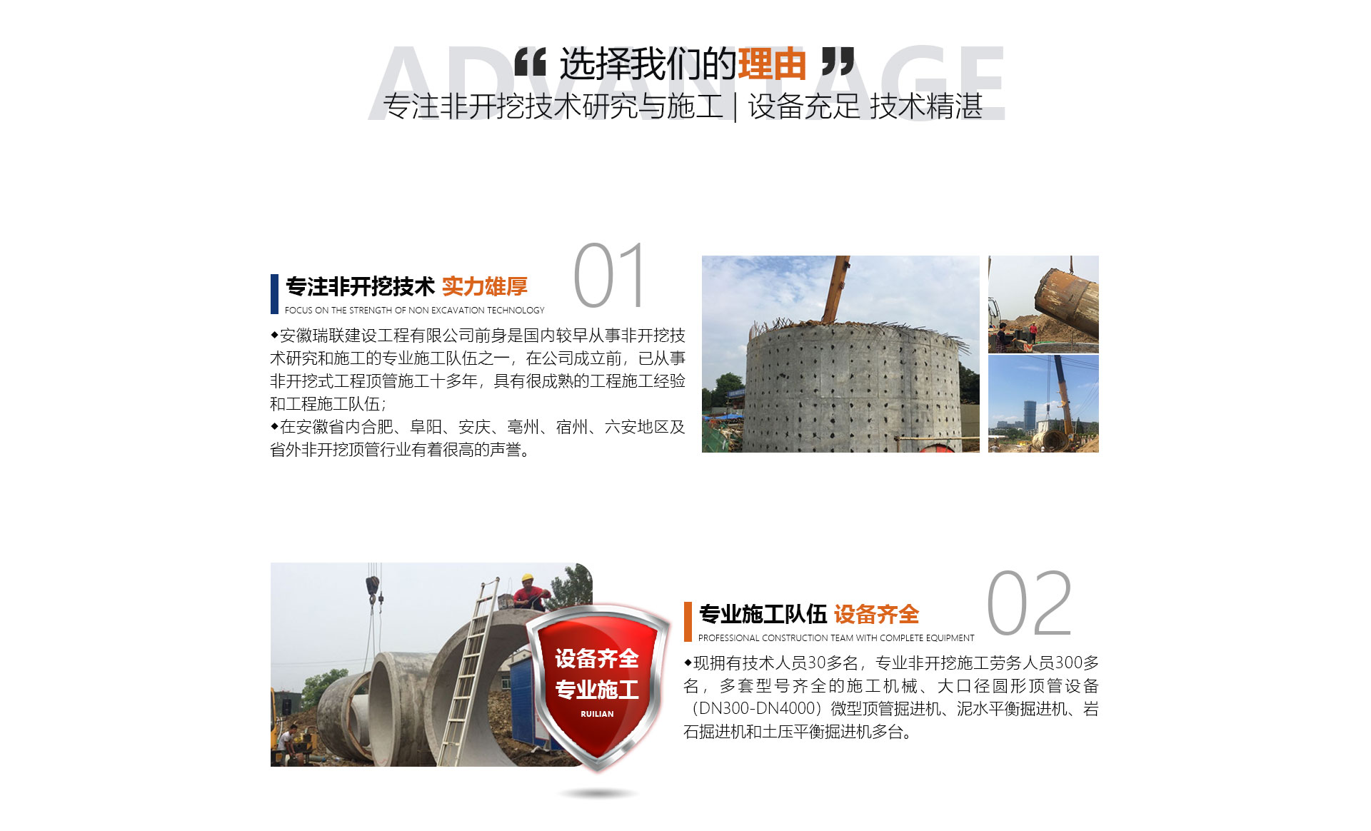 安徽瑞聯(lián)建設(shè)工程有限公司前身是國內(nèi)較早從事非開挖技術(shù)研究和施工的施工隊伍之一,在公司成立前,已從事非開挖式工程頂管施工十多年,具有很成熟的工程施工經(jīng)驗(yàn)和工程施工隊伍,在安徽省內(nèi)合肥、阜陽、安慶、亳州、宿州、六安地區(qū)及省外非開挖頂管行業(yè)有著很高的聲譽(yù)。面對日益擴(kuò)大的市場,公司于2014年正式成立,公司擁有勞務(wù)分包及市政公用工程總承包資質(zhì)。公司優(yōu)勢(文字):現(xiàn)擁有中高技術(shù)人員30多名,非開挖施工勞務(wù)人員300...